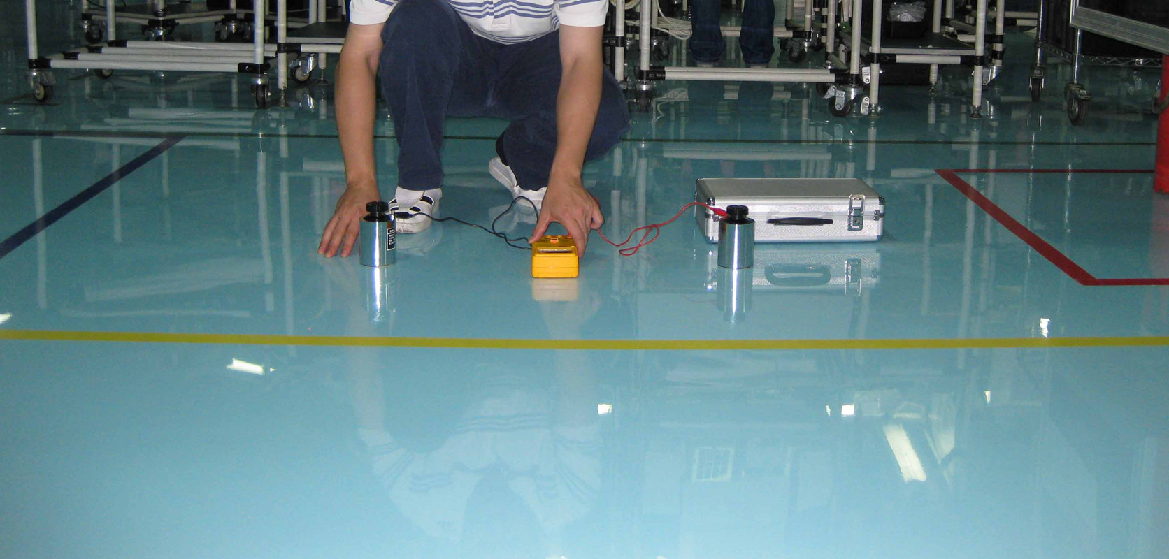 ⑦防靜電面漆: 防靜電自流平面漆鏝一道或滾涂二道,其體積/表面電阻平均系數值1X106~1X109Ω,完工后整體地面光亮潔凈,顏色均一;